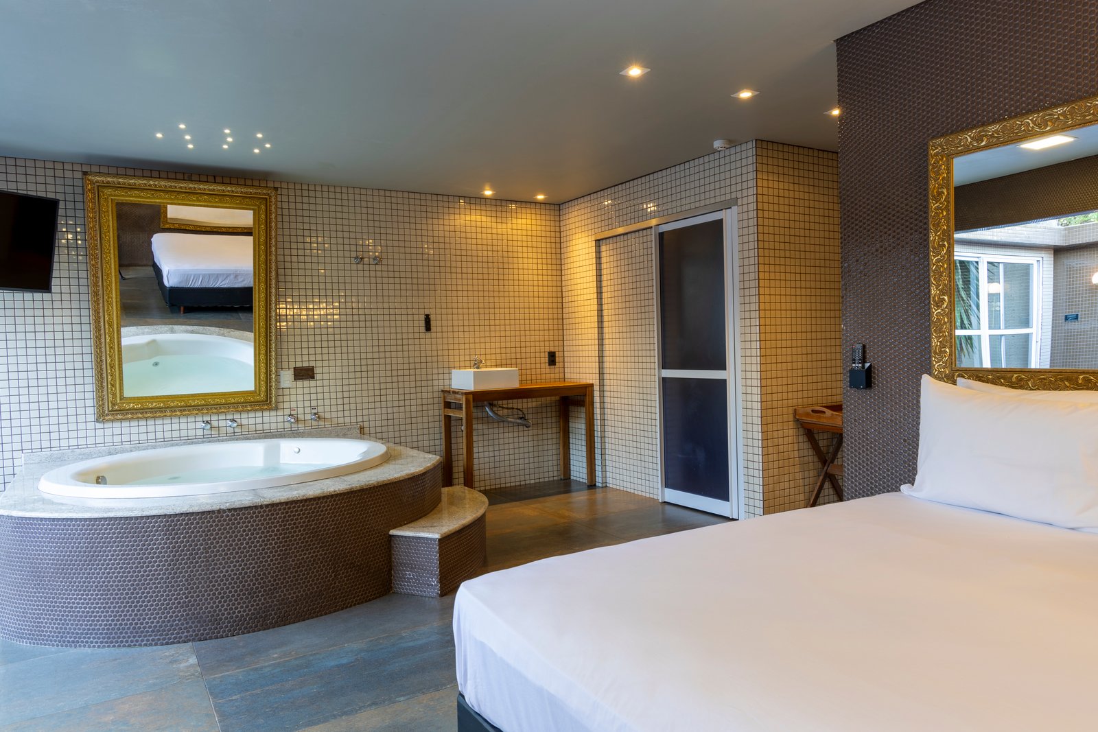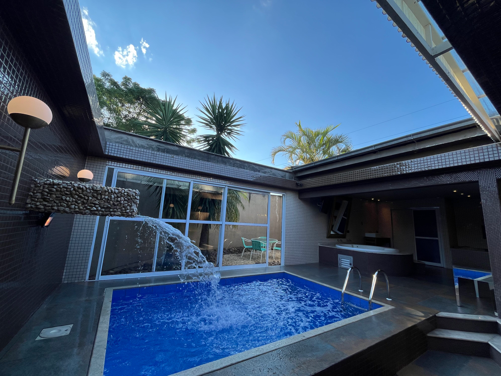 A melhor suíte com ampla hidromassagem, piscina aquecida e teto solar, ideal para um banho com vista para as estrelas para confraternizações intimistas.